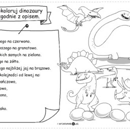 Pokoloruj dinozaury zgodnie z opisem. Trening czytania ze zrozumieniem