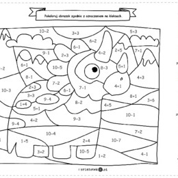 Zakodowana kolorowanka z dinozaurem. Dodawanie i odejmowanie do 10