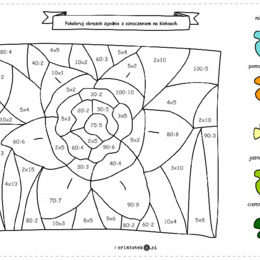 Kolorowanka matematyczna z żonkilem. Mnożenie i dzielnie do 100 przez 1-10