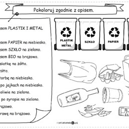 Pokoloruj śmieci i śmietniki zgodnie z opisem. Trening czytania ze zrozumieniem