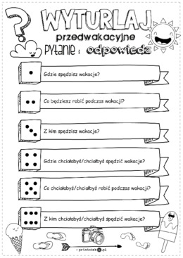 Materiał zawiera dwie karty. Do gry potrzebna będzie wydrukowana wybrana plansza oraz kostka. Gracze (lub gracz) kolejno rzucają pięć razy kostką i zapisują zdanie utworzone z wyrazów umieszczonych pod wylosowanymi liczbami oczek. Materiał językowy do drugiej karty został opracowany przez Monikę Walkowiak.