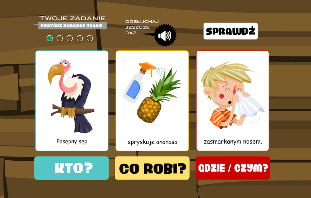 Posłuchaj nagrania, a następnie na jego podstawie odszukaj prawidłowe ilustracje z podpisami, tworzące odsłuchane zdanie. Klikaj na ilustracje, aby odsłonić kolejne na stosie. Ilustracje zapętlają się, jeśli przegapiłeś odpowiednią, możesz do niej wrócić, klikając aż do jej odsłonięcia. Nagranie można ponownie odtworzyć, klikając przycisk "odsłuchaj jeszcze raz". Po ułożeniu wszystkich części zdania sprawdź, czy zgadza się z nagraniem, klikając przycisk "sprawdź". Gra ma pięć etapów.