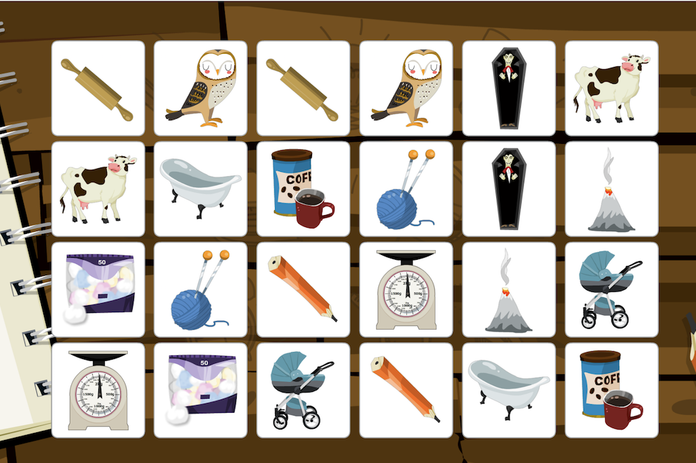 Połącz obrazki w pary. Kliknij tabliczkę, a następnie drugą z tym samym obrazkiem. Powtórz nazwę obrazka czytaną przez lektora. Poprawnie zaznaczone pary znikają z planszy.