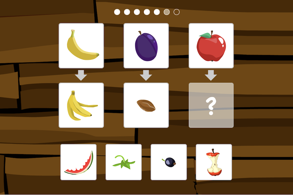 Przyjrzyj się ilustracjom w górnym rzędzie i wskazanym przez nie obrazkom figur. Wskaż właściwy obrazek z dolnego rzędu, który analogicznie do pozostałych będzie pasował w miejsce oznaczone znakiem zapytania.