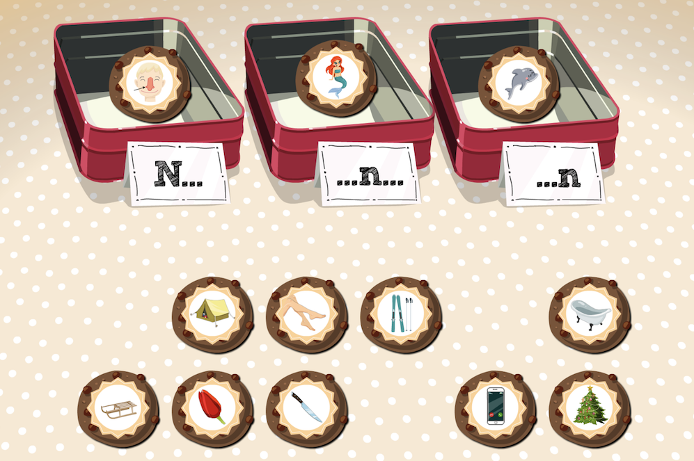 Umieść ciasteczka w odpowiednich puszkach. Ciastka, na których nazwa ilustracji zaczyna się głoską N, przenieś do puszki po lewej stronie, ciastka, na których nazwa ilustracji ma głoskę N w środku, przenieś do puszki po środku, a ciastka, na których nazwa ilustracji kończy się głoską N, przenieś do puszki po prawej stronie ekranu. Aby przenieść ciastko, kliknij je, a następnie wybraną puszkę. Prawidłowo umieszczony element zostaje na swoim miejscu.