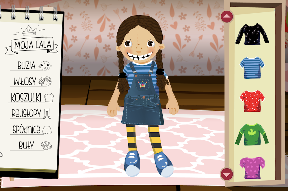 Ubierz lalę. Po lewej stronie znajdują się zakładki z kolejnymi elementami wyglądu lali, a po prawej elementy. Kliknij wybrany element, a pojawi się on w odpowiednim miejscu na ekranie. Możesz zmienić raz wybrane element, wybierając inny, który zajmie jego miejsce.