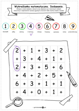 Materiał zawiera kartę z wykreślanką, w której uczeń ma za zadanie wykreślić działania zgodnie z przykładem, których sumy wskazane są w kolorowych kółkach.