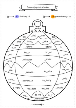 Materiał zawiera kartę z ilustracją bombki, w której uczeń ma za zadanie uzupełnić słowa i pokolorować kartę według kodu.