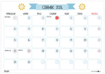 Karta z kalendarza na czerwiec 2026 roku z oznaczeniem najważniejszych świąt i miejscem na notatki przy każdym dniu miesiąca.