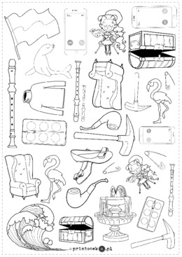 Materiał zawiera 2 karty. Na pierwszej znajduje się wieloelementowa kolorowanka, na drugiej karta kontrolna z podpisanymi elementami wykorzystanymi na karcie pierwszej, które należy policzyć. Nazwy ilustracji użytych w materiale nie zawierają głosek dentalizowanych i głoski [w].