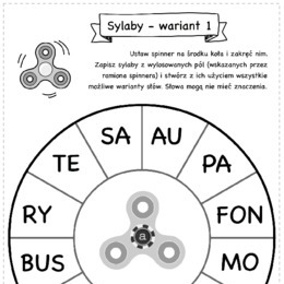 Materiał zawiera 4 karty. Na pierwszej karcie znajduję się plansza z piktogramami przedmiotów, których nazwy rozpoczynają się od głoski [ż], ułożonych na obwodzie koła, na kolejnej te same obrazki znajdują się z podpisami w szablonie do wycięcia. Na trzeciej karcie plansza z kołem zawiera ilustracje przedmiotów, których nazwy zawierają głoskę [ż] w śródgłosie. Ostatnia plansza zawiera ilustracje z wcześniejszej karty z podpisami w szablonie do wycięcia. Kart można używać wraz ze spinnerem, który układamy na środku koła, a następnie wprowadzamy w ruch. Dziecko ma za zadanie nazwać i odnaleźć na karcie z piktogramami ilustracje wylosowane przez ramiona spinnera. Karty można również wykorzystać do zabawy w oznaczanie wybranych ilustracji poprzez przypinanie klamerek do obwodu wyciętego koła. Na klamerki można przykleić wycięte piktogramy z ostatniej karty. Do zabawy możemy użyć kart z podpisami, bez podpisów lub samych podpisów.