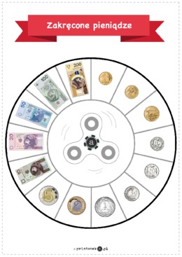 Materiał zawiera 3 karty. Na dwóch pierwszych znajdują się wersje planszy z banknotami i monetami na obwodzie koła, na ostatniej karcie znajdują się podpisane ilustracje banknotów i monet. Dziecko wprawia ustawionego na środku planszy spinnera w ruch, a następnie np. dodaje wszystkie trzy wylosowane nominały.