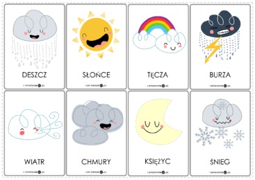 Materiał zawiera 4 strony. Na pierwszej znajdują się ilustracje zjawisk atmosferycznych podpisanych dużymi literami, na drugiej małymi, na trzeciej bez podpisów. Na ostatniej stronie znajdują się cienie ilustracji z wcześniejszych stron.