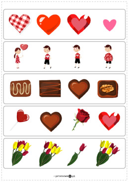 Materiał zawiera kartę z 5 paskami, na których znajdują się zbiory obiektów. W każdym z pasków jeden z obrazków nie pasuje do pozostałych, dziecko ma za zadanie wskazać, który i wytłumaczyć dlaczego.