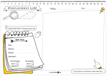 Materiał zawiera 10 kart, na których dziecko ma za zadanie odnaleźć wskazany na miniaturce liść i uzupełnić tabele z jego danymi oraz odrysować znaleziony liść. Na kartach kolejno znajdują się miniaturki liści drzew: dąb, kasztanowiec, klon, buk, jarzębina, lipa, olcha, brzoza, topola osika. Materiał powstał przy współpracy z Jolantą Okuniewską.