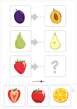 Materiał zawiera 9 kart. Dziecko ma za zadanie wybrać i umieścić na znaku zapytania jeden z obrazków, który pasuje do obrazka po lewej stronie na zasadzie analogii z wyżej przedstawionymi obrazkami.