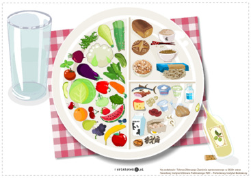 Materiał zawiera 3 karty. Na pierwszej znajduje się plansza edukacyjna z Talerzem Zdrowego Żywienia, na drugiej karcie znajduje się pusty talerz podzielony na trzy części, na ostatniej znajdują się ilustracje produktów spożywczych do wycięcia. Na planszę z drugiej karty dzieci mają za zadanie przykleić wycięte wybrane produkty w odpowiednie miejsca, tworząc swój talerz zdrowego żywienia.