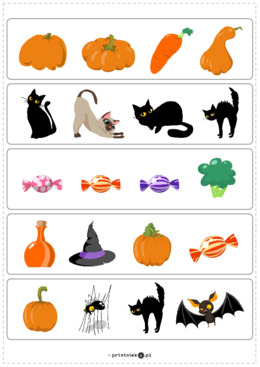 Materiał zawiera kartę z 5 paskami, na których znajdują się zbiory obiektów. W każdym z pasków jeden z obrazków nie pasuje do pozostałych, dziecko ma za zadanie wskazać, który i wytłumaczyć dlaczego.