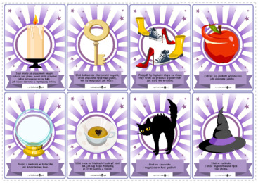 Materiał zawiera dwie strony do druku dwustronnego, na których umieszczono 8 kart z opisanymi i zilustrowanymi ćwiczeniami gimnastycznymi w magicznej oprawie.