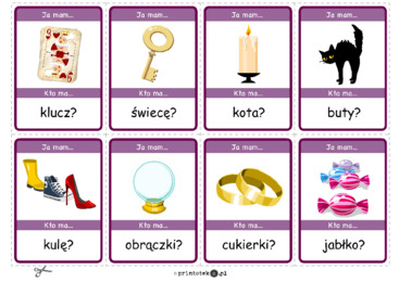 Materiał zawiera 2 plansze z 16 kartami do gry typu „Ja mam. Kto ma?”. Wydrukowane, wycięte wzdłuż przerywanej linii i potasowane karty rozdajemy wśród graczy. Wybrana osoba rozpoczyna grę, wykładając kartę i odczytując zdania i nazwy obrazków przedstawionych na karcie. Osoba, która ma kartę z obrazkiem wymienionym przez pierwszego gracza, kontynuuje grę. Gra kończy się, kiedy pierwszy z graczy pozbędzie się wszystkich kart, a wygrywa gracz, który zgromadził najwięcej punktów za prawidłowe odpowiedzi.