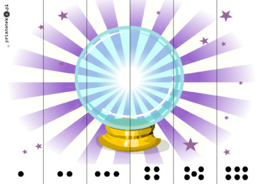 Materiał zawiera 6 kart. Kolejno na kartach znajdują się ilustracje kryształowej kuli, wróżenia z wosku, wróżenia z butów, jabłka z obierkiem, fusów w filiżance i kart do gry. Przecięte wzdłuż linii karty pomogą w ćwiczeniu liczenia oraz w ćwiczeniach analizy i syntezy wzrokowej. Zestawu możemy również użyć do zabawy w prostą grę towarzyską. Do gry potrzebna będzie kostka i tyle kompletów kart, ilu jest uczestników. Każdy z uczestników dostaje paski z wszystkimi ilustracjami, które odkłada na bok, po kolei uczestnicy gry rzucają kostką, a następnie wybierają pasek z kropkami odpowiadającymi liczbie oczek wylosowanych na kostce. Jeśli w puli nie ma już obrazków z liczbą oczek odpowiadającą wyrzuconej na kostce, kolejka przechodzi na następnego uczestnika gry. Celem jest jak najszybsze ułożenie kompletnego obrazka.