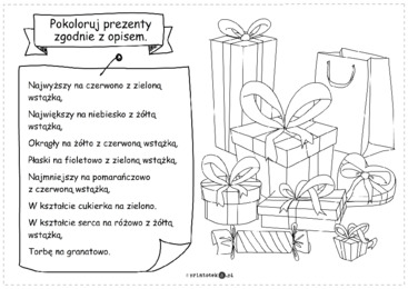 Pokoloruj prezenty zgodnie z opisem. Trening czytania ze zrozumieniem