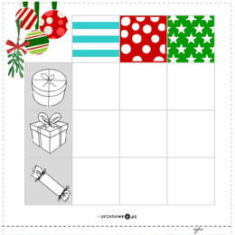 Materiał zawiera 7 kart. Na pierwszej znajduje się plansza do zabawy, na kolejnych czterech zabawki do wycięcia, na ostatnich dwóch listy zawierające liczbę i rodzaj zabawek. Dziecko ma za zadanie umieścić wycięte zabawki na ilustracji worka Mikołaja zgodnie z wybraną listą.