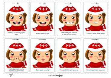 Materiał zawiera 2 arkusze z 16 kartami, na których przedstawiono opisane ćwiczenia buzi i języka.