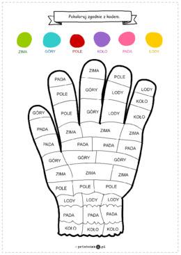 Materiał zawiera kartę z ilustracją rękawiczki, w której uczeń ma za zadanie pokolorować obrazek według kodu.