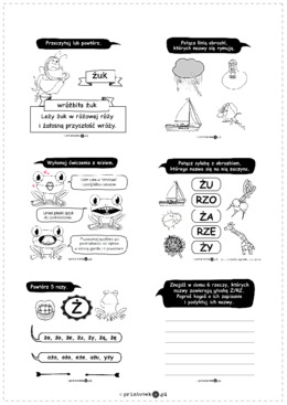 Materiał zawiera 2 karty. Na ostatniej karcie znajduje się szablon, na który należy nakleić karteczki post-it, a następnie umieścić go w odpowiedniej pozycji w drukarce (jeśli nie wiadomo, w jaki sposób pobierany jest papier z podajnika, proponujemy zrobić test, zaznaczając na górze pierwszej kartki w podajniku strzałkę, a następnie drukując arkusz). Na pierwszej karcie znajdują się wklejki z ćwiczeniami głoski Ż do wydrukowania na szablonie, na którym przyklejone zostały karteczki post-it. Proponujemy wydrukowane karteczki wręczyć rodzicom, którzy codziennie podczas przerwy pomiędzy zajęciami logopedycznymi przyklejają kolejną karteczkę w domu, dziecko ma za zadanie odnaleźć karteczkę, wykonać zadanie i wkleić ją do zeszytu.