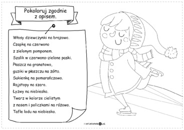 Pokoloruj dziewczynkę na łyżwach zgodnie z opisem. Trening czytania ze zrozumieniem