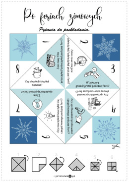 Materiał zawiera kartę z kolorowym szablonem do przygotowania zabawy w piekło-niebo. Kartę należy wydrukować, wyciąć i złożyć zgodnie z instrukcją. Dzieci losują wybrany numer i odpowiadają na ukryte pod nim pytanie związane z feriami zimowymi.