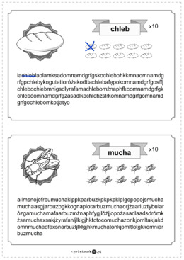Materiał zawiera 2 karty z 4 wykreślankami. Zadaniem ucznia jest odnalezienie podanego wyrazu w ciągu liter, tyle razy ile określa liczba wskazana przy szukanym wyrazie. Wyrazy do odnalezienia: chleb, mucha, schody, chmura.