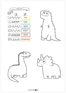Materiał zawiera 5 kart. Pierwsza karta jest poglądowa, na kolejnej znajduje się plansza do gry, a na następnych szablony z ilustracjami dinozaurów. Do zabawy potrzebujemy dwóch kostek sześciennych, wydrukowanej planszy (drugi arkusz) i wybranego szablonu z ilustracją. Dziecko ma za zadanie rzucić kostkami, znaleźć wyrzucone liczby w tabeli i narysować w liniach ilustracji wzór zgodnie ze znalezionymi współrzędnymi. Liczba oczek na jednej kostce odpowiada wzorowi, a na drugiej kolorowi. Kostkami rzucamy tak długo, aż wszystkie paski w ilustracji zostaną uzupełnione o kolorowe wzorki.