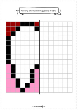 Materiał zawiera trzy karty. Na pierwszej karcie dziecko ma za zadanie dorysować symetryczną do lewej połowę, na drugiej znajduje się tabela oraz współrzędne określające kolor poszczególnych pól. Dziecko ma za zadanie uzupełnić tabelę, kolorując wskazane kratki we wskazanym kolorze. Na ostatniej znajduje się obrazek w tabeli oraz miejsce na spisanie współrzędnych.