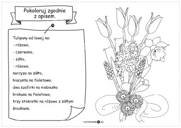 Pokoloruj wiosenne kwiaty zgodnie z opisem. Trening czytania ze zrozumieniem