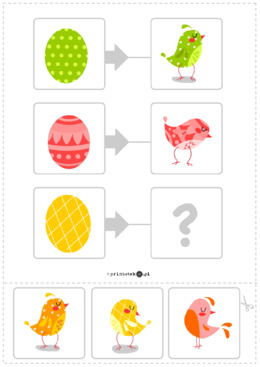Materiał zawiera 10 kart. Dziecko ma za zadanie wybrać i umieścić na znaku zapytania jeden z obrazków, który pasuje do obrazka po lewej stronie na zasadzie analogii z wyżej przedstawionymi obrazkami.