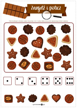 Materiał zawiera trzy karty, na których dziecko ma za zadanie policzyć elementy występujące na planszy, a następnie połączyć je linią z kostką, której liczba oczek odpowiada liczbie danego elementu na planszy.