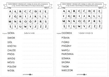 Materiał zawiera 2 karty, na których znajdują się 4 ćwiczenia polegające na utworzeniu i rozwiązaniu zadań poprzez odczytanie kolejnych cyfr (znajdujących się w rogu klocków) odpowiadających kolejnym literom odszyfrowywanego słowa. We wszystkich ćwiczeniach materiał wyrazowy związany zawiera literę "ó". Materiał powstał przy współpracy z Anną Grzegory z poradni Logofigle.